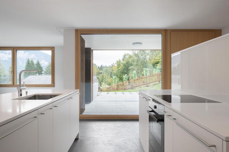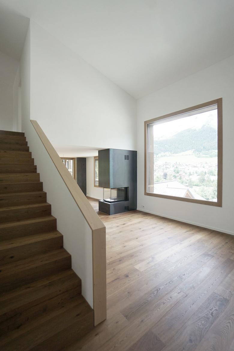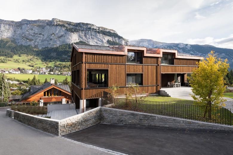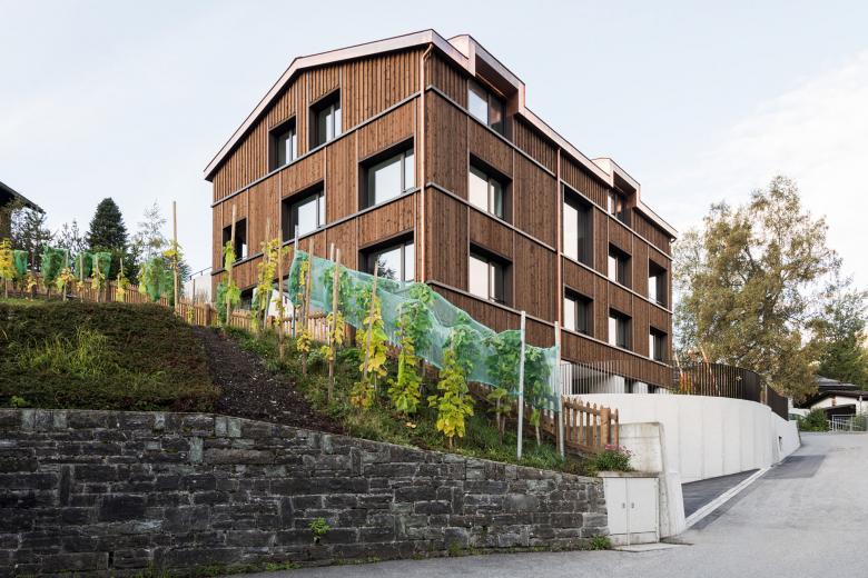 Die steile Hanglage wird zum Konzept. Alle vier Wohnungen werden über grosszügige gedeckte Veranden erschlossen, welche rund um das Haus verteilt auf verschiedenen Niveaus liegen. Grossflächige Öffnungen orientieren sich mehrheitlich zum nordseitigen Panorama hin. Die privaten Aussenräume sind in die sanft bearbeitete Geländemodellierung eingeschliffen. Sockel und Tragwerk sind in massiver Bauweise erstellt, die vorfabrizierte Gebäudehülle in Holz integriert sich zurückhaltend in den gebauten Kontext und ermöglichte eine zeitoptimierte Bauweise. Im Innern nobilitieren Eichenfenster und Holzparkett die dezente Farbigkeit. Küchenmöbel mit integrierter Garderobe zonieren den Wohnbereich und vermitteln zwischen Eingangs-, Tages-, und Nachtbereich.